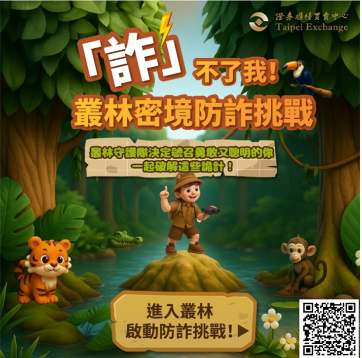 金融投資詐騙案件層出不窮,歹徒詐騙手法日新月異,櫃檯買賣中心自114年9月22日(一)至114年11月16日(日),推出為期八週「詐不了我!叢林密境防詐挑戰」線上遊戲,本次活動以叢林探險為主軸,透過簡易生動的互動遊戲,介紹常見詐騙手法,幫助民眾認識現實生活中可能會遇到的各種詐騙類型,提高識詐能力。詳情請至櫃買中心活動網頁活動辦法查詢。