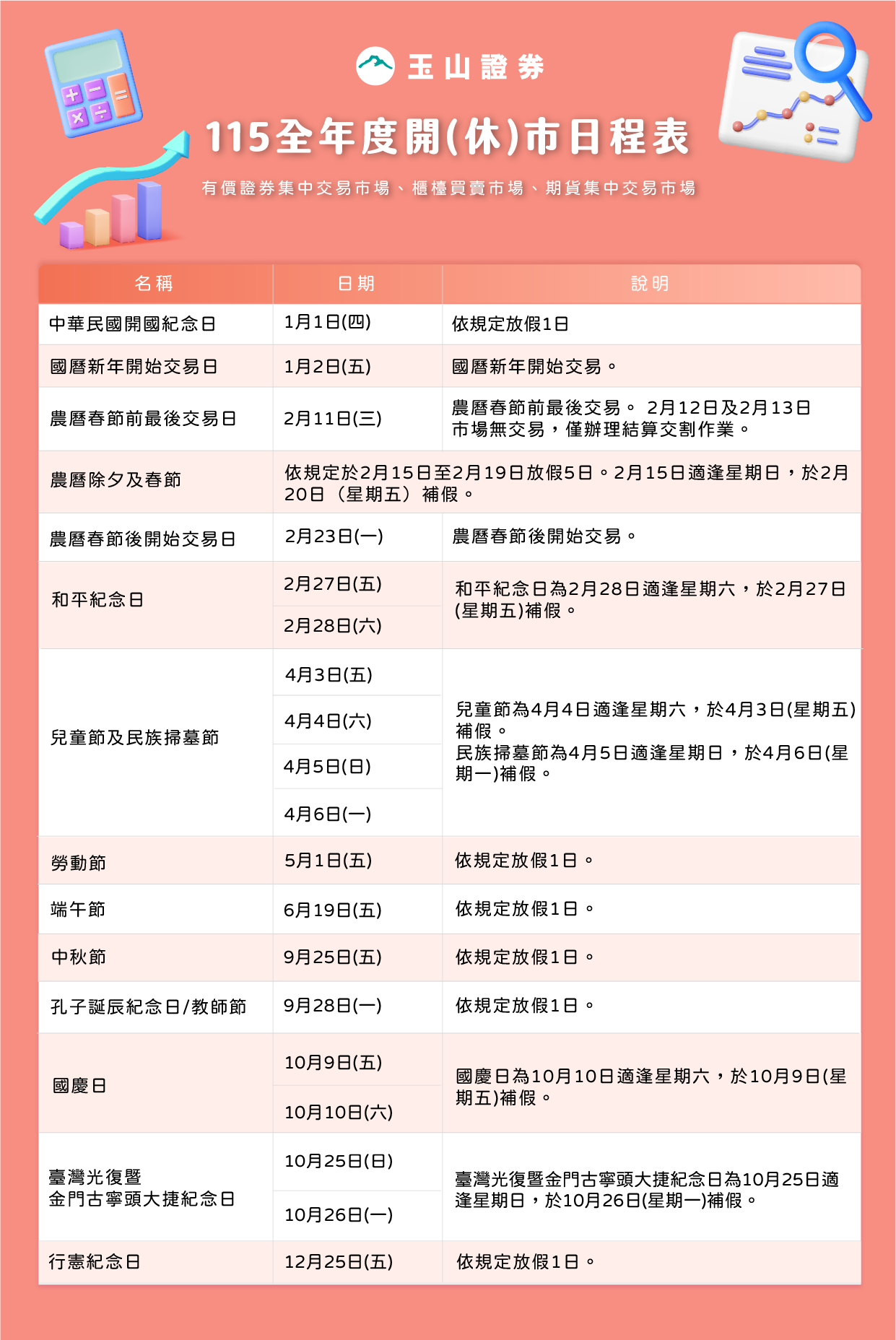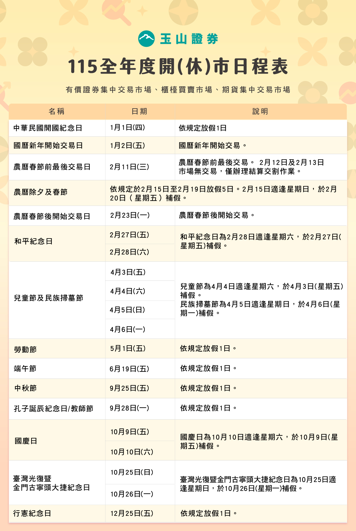 115全年度有價證券集中交易市場、櫃檯買賣市場及期貨集中交易市場開(休)市日程表