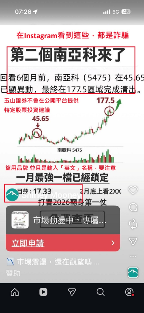 2026/01/13【澄清公告】慎防冒名「玉山證券」之Instagram詐騙帳號聲明